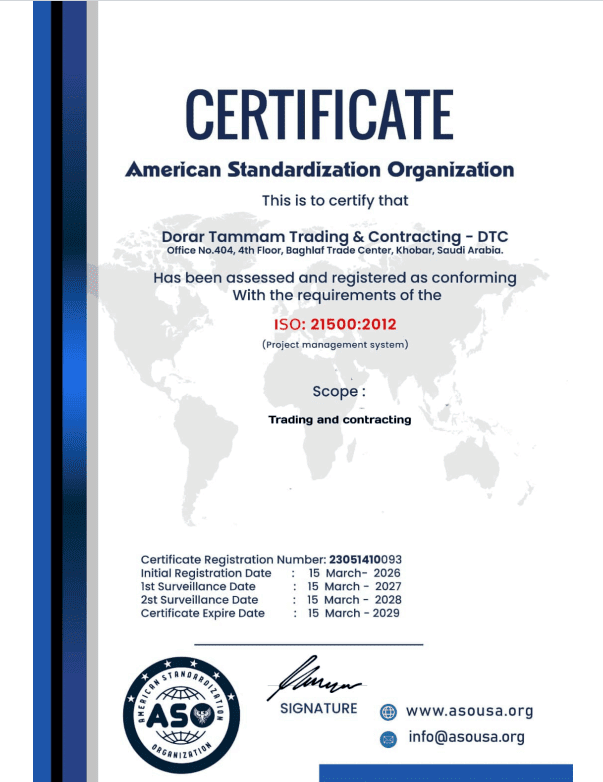 By achieving ISO 21500:2012 Project Management System certification, Dorrar Tammam Contracting demonstrates its commitment to international project management standards and professional project delivery.
